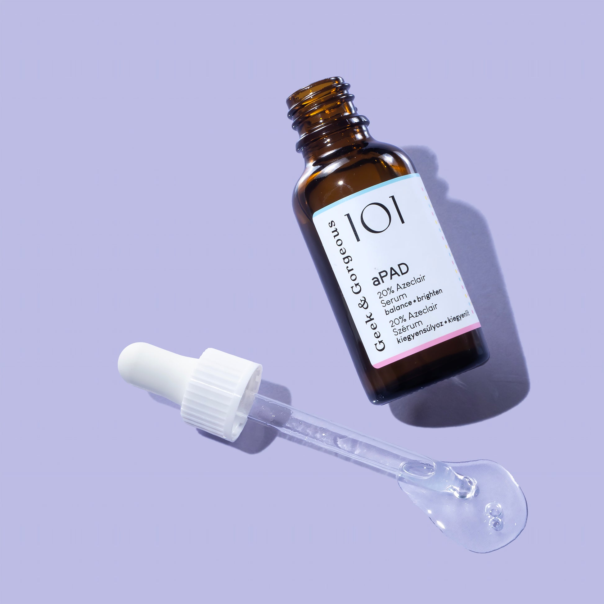 Un suero sedoso y ligero que contiene un 20% de Azeclair, con un poderoso derivado del ácido azelaico (diglicinato azeloico de potasio o PAD), diseñado para normalizar la producción de sebo, unificar el tono de la piel y calmarla.