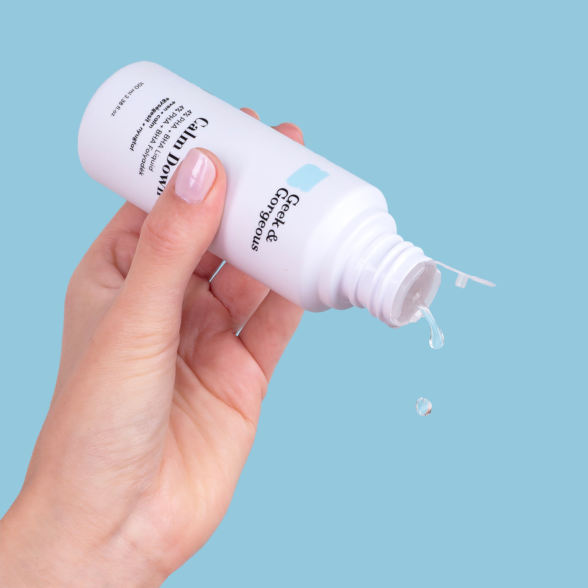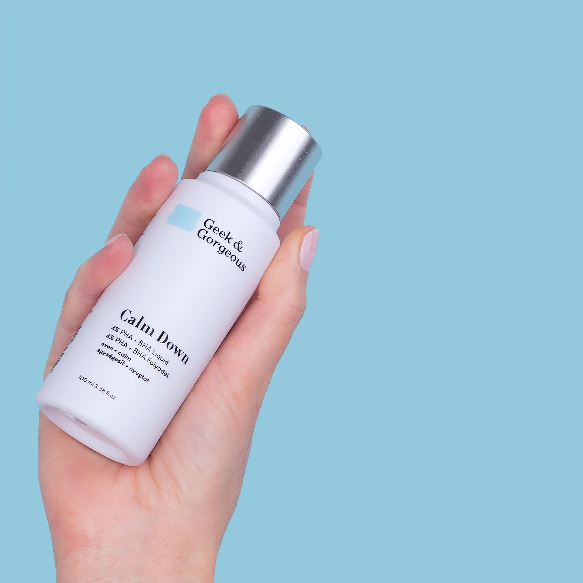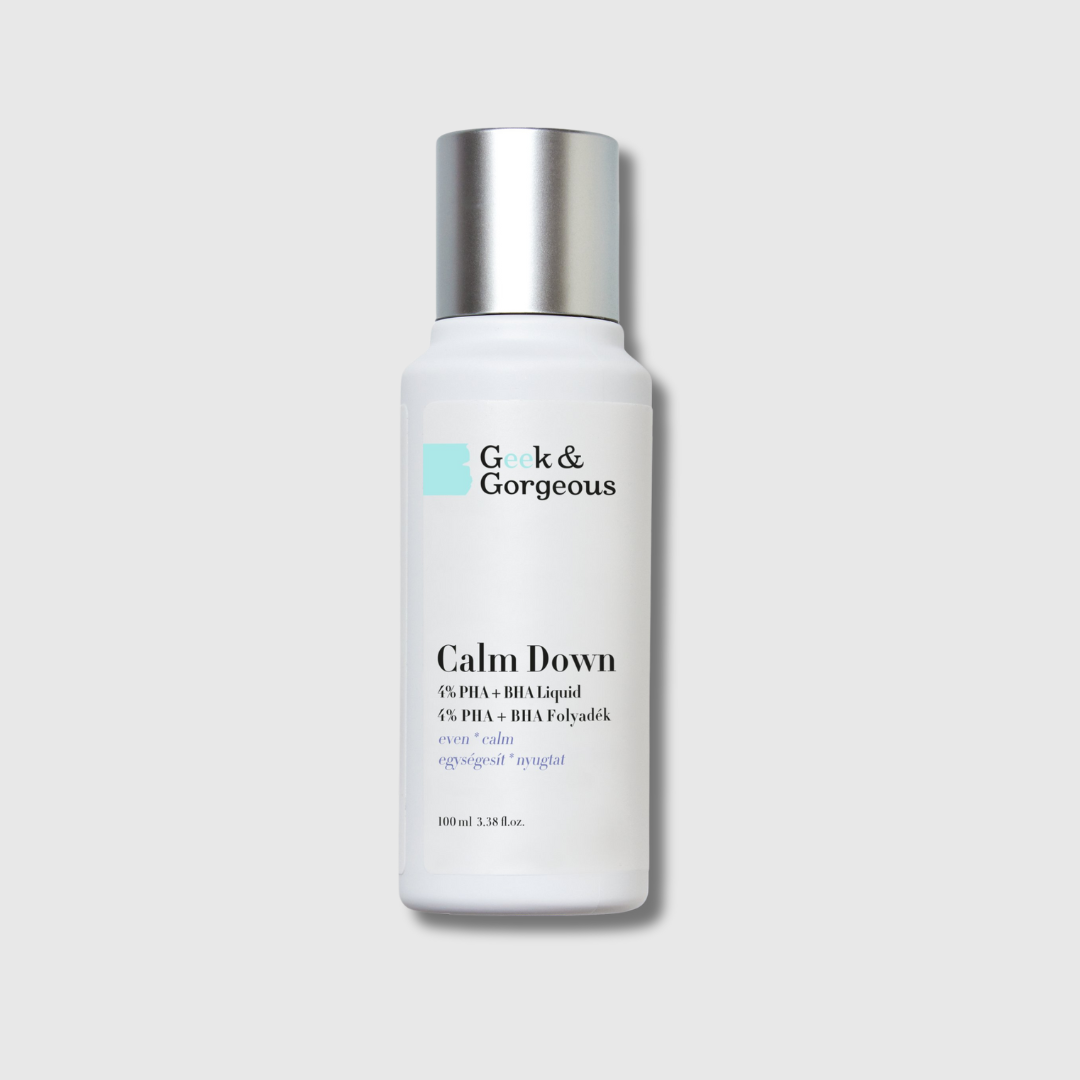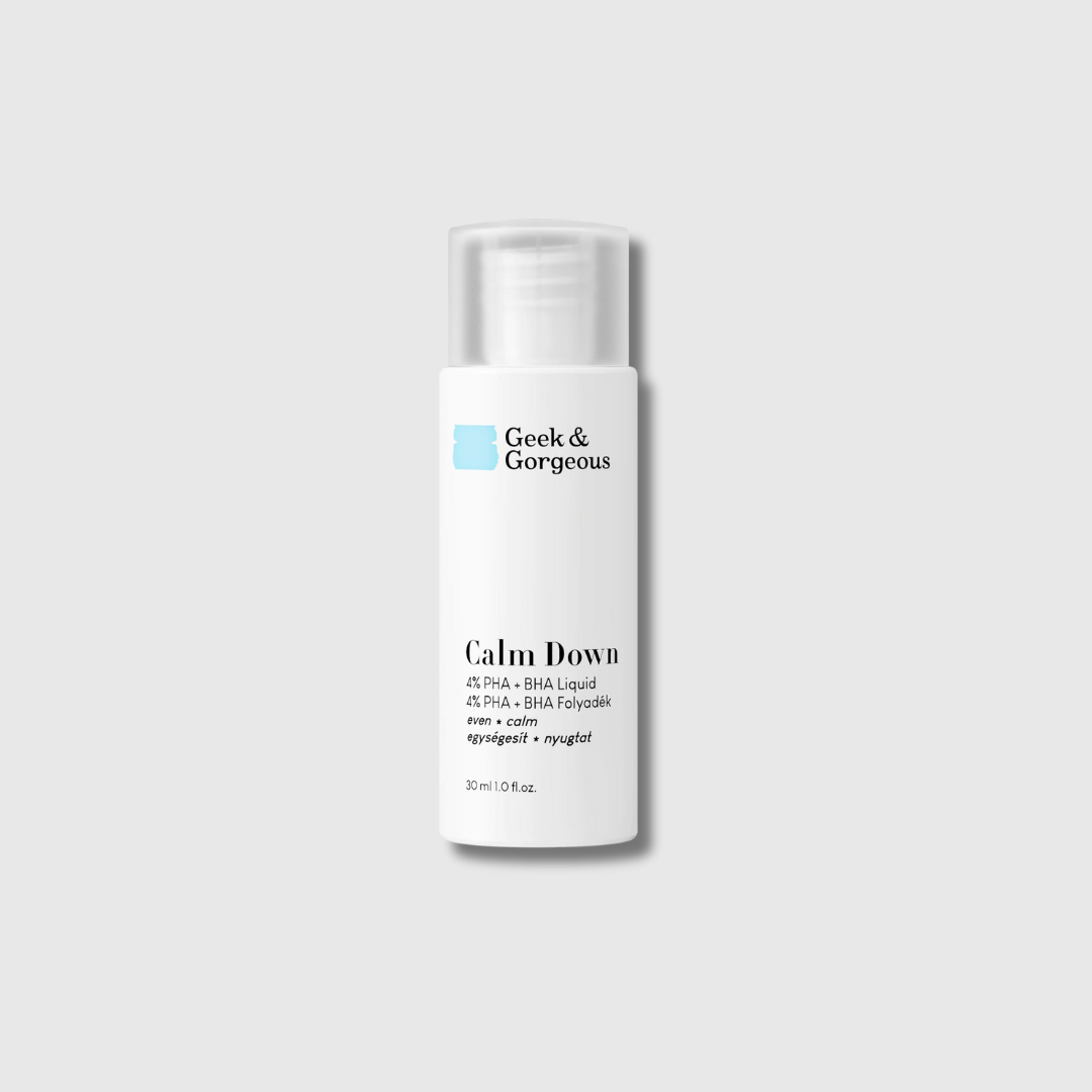 Geek & Gorgeous Calm Down es un exfoliante líquido ultrasuave, especialmente formulado para pieles sensibles. Combina un 4 % de ácidos PHA y BHA para brindar una luminosidad saludable a la vez que calma, protege e hidrata la piel.