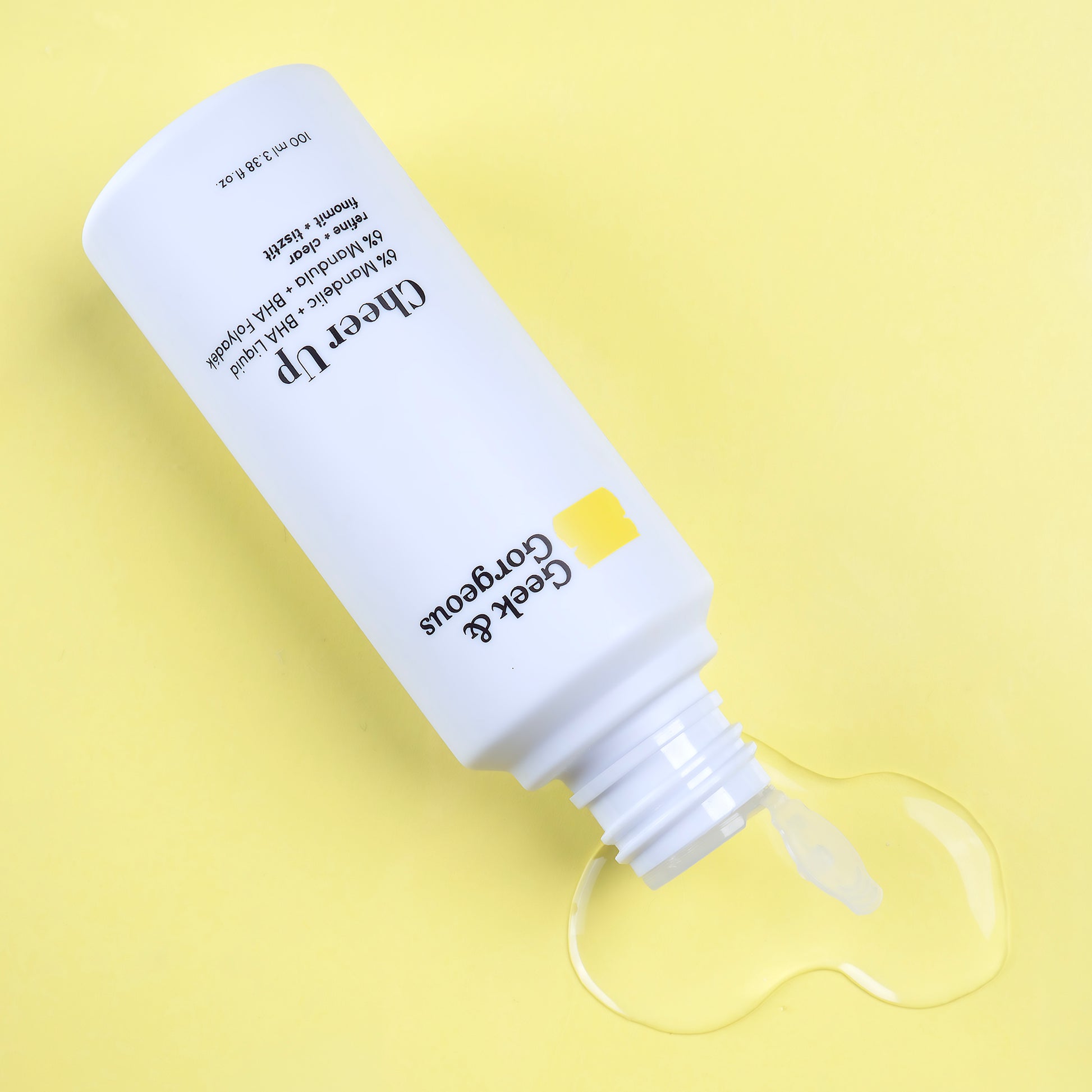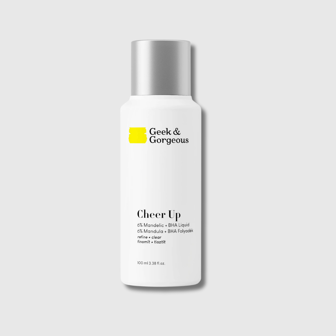 Cheer Up de Geek & Gorgeous es un exfoliante líquido diseñado para pieles mixtas a grasas, que combina un 5% de ácido mandélico (AHA) y un 1% de ácido salicílico (BHA) para exfoliar suavemente la superficie de la piel y el interior de los poros.