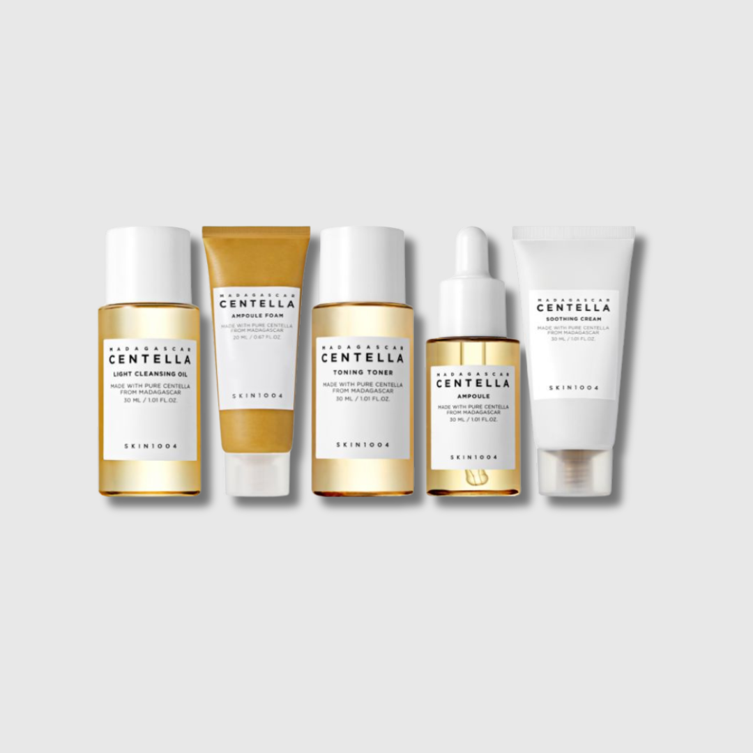 El Kit de Viaje SKIN1004 Centella de Madagascar contiene cinco productos esenciales de la línea Centella para cuidar tu piel, incluso fuera de casa. Este práctico set incluye: