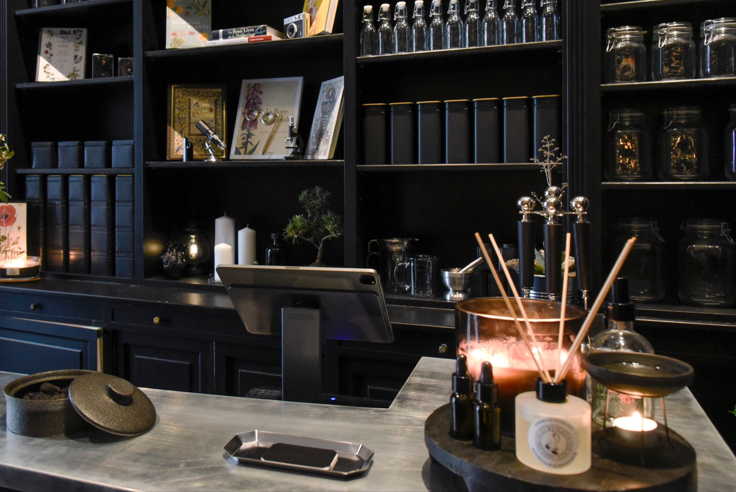 Cette pièce vous plonge dans l’univers des apothicaires traditionnels, où le charme du passé se mêle au prestige du présent. Les grandes bibliothèques en bois noir s’élèvent le long des murs, mettant en valeur nos produits dans un cadre à la fois mystérieux et intimiste pendant que les murs en tadelakt marocain noir apportent une touche minérale, rappelant les savoir-faire ancestraux.